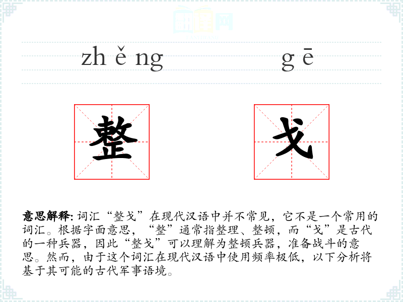 词汇“整戈”在现代汉语中并不常见,它不是一个常用的词汇。根据字面意思,“整”通常指整理、整顿,而“戈”是古代的一种兵器,因此“整戈”可以理解为整顿兵器,准备战斗的意思。然而,由于这个词汇在现代汉语中使用频率极低,以下分析将基于其可能的古代军事语境。