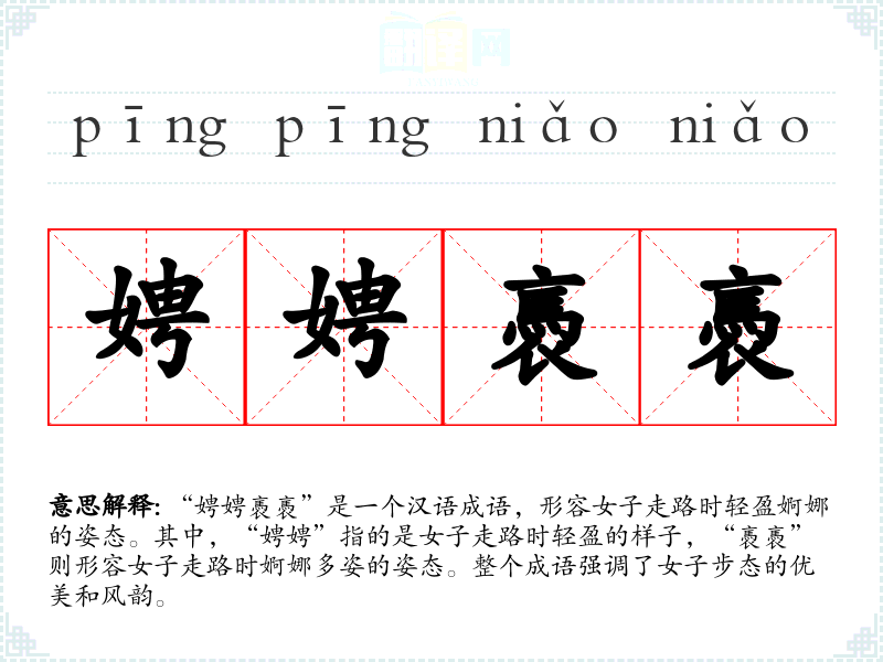 - 婀娜多姿:形容女子姿态柔美,与“娉娉褭褭”意思相近。
