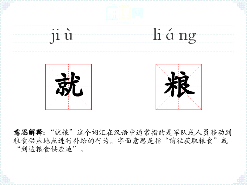 “就粮”这个词汇在汉语中通常指的是军队或人员移动到粮食供应地点进行补给的行为。字面意思是指“前往获取粮食”或“到达粮食供应地”。