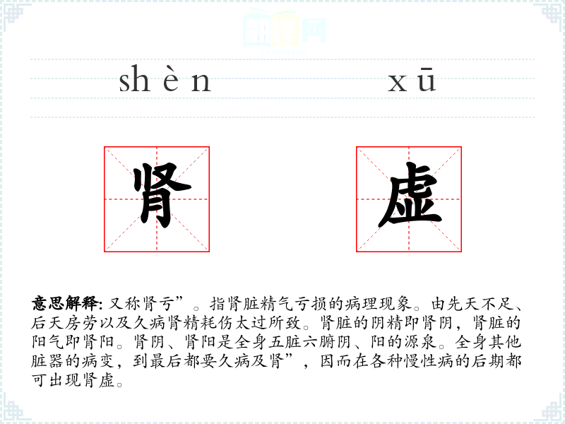 1.又称肾亏”。指肾脏精气亏损的病理现象。由先天不足、后天房劳以及久病肾精耗伤太过所致。肾脏的阴精即肾阴,肾脏的阳气即肾阳。肾阴、肾阳是全身五脏六腑阴、阳的源泉。全身其他脏器的病变,到最后都要久病及肾”,因而在各种慢性病的后期都可出现肾虚。