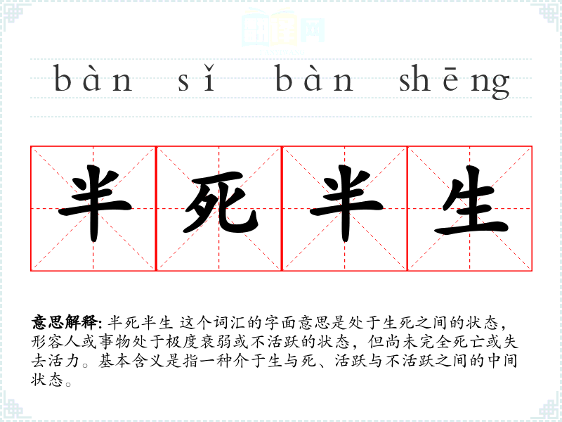 半死半生 这个词汇的字面意思是处于生死之间的状态,形容人或事物处于极度衰弱或不活跃的状态,但尚未完全死亡或失去活力。基本含义是指一种介于生与死、活跃与不活跃之间的中间状态。
