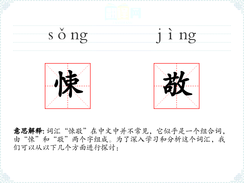 “悚”字源自古代汉语,意为恐惧;“敬”字同样源自古代汉语,意为尊敬。这两个字的组合可能是现代汉语中的一种创新用法,用以表达一种复杂的情感状态。