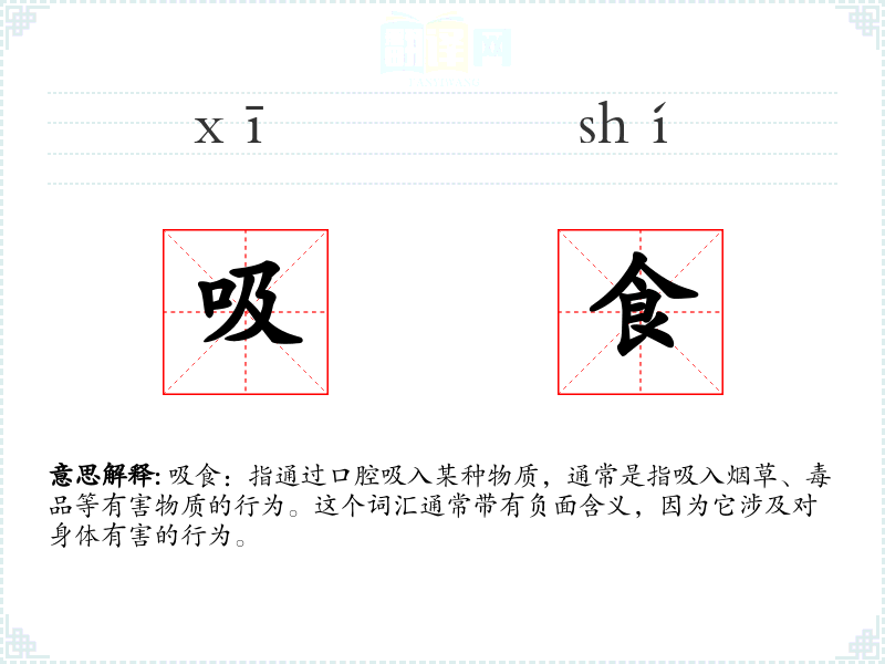 吸食:指通过口腔吸入某种物质,通常是指吸入烟草、毒品等有害物质的行为。这个词汇通常带有负面含义,因为它涉及对身体有害的行为。