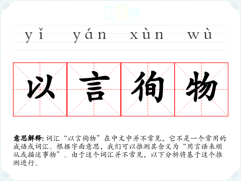 词汇“以言徇物”在中文中并不常见,它不是一个常用的成语或词汇。根据字面意思,我们可以推测其含义为“用言语来顺从或描述事物”。由于这个词汇并不常见,以下分析将基于这个推测进行。