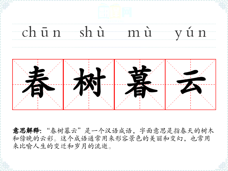 “春树暮云”这个成语不仅描绘了美丽的自然景色,也反映了人们对时间流逝的感慨。在我的语言学*和表达中,它是一个富有诗意和哲理的词汇,能够丰富我的表达和理解。