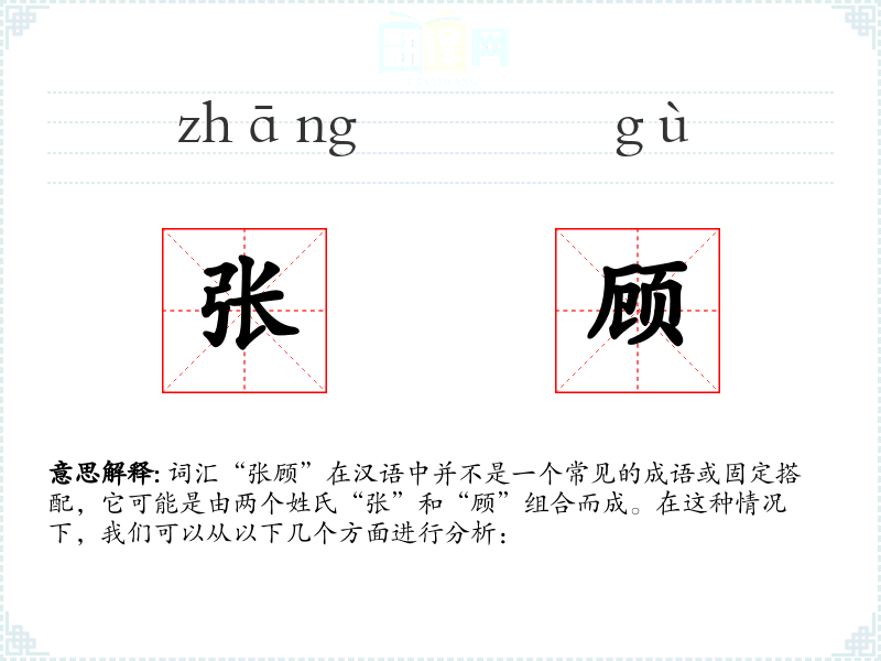 - 理解:“张顾”作为一个词汇,主要是作为姓氏的组合,没有特定的含义,但在特定语境中可以有丰富的应用。