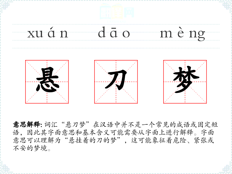 词汇“悬刀梦”在汉语中并不是一个常见的成语或固定短语,因此其字面意思和基本含义可能需要从字面上进行解释。字面意思可以理解为“悬挂着的刀的梦”,这可能象征着危险、紧张或不安的梦境。
