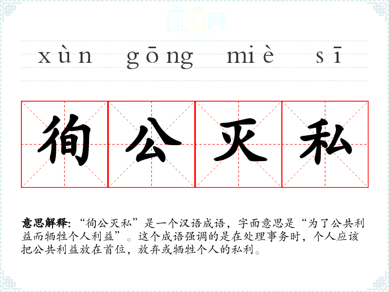 “徇公灭私”是一个汉语成语,字面意思是“为了公共利益而牺牲个人利益”。这个成语强调的是在处理事务时,个人应该把公共利益放在首位,放弃或牺牲个人的私利。