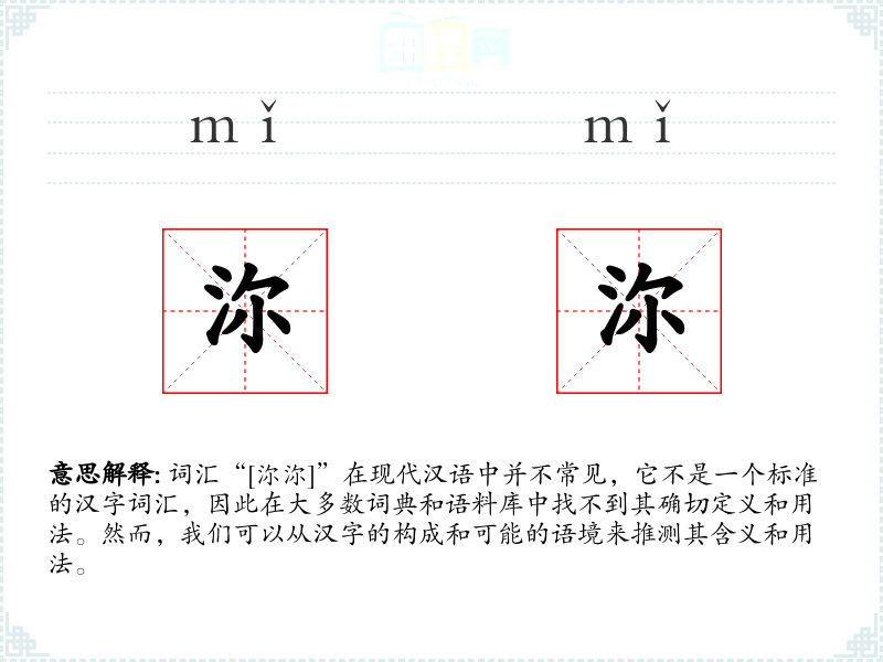 词汇“[沵沵]”在现代汉语中并不常见,它不是一个标准的汉字词汇,因此在大多数词典和语料库中找不到其确切定义和用法。然而,我们可以从汉字的构成和可能的语境来推测其含义和用法。