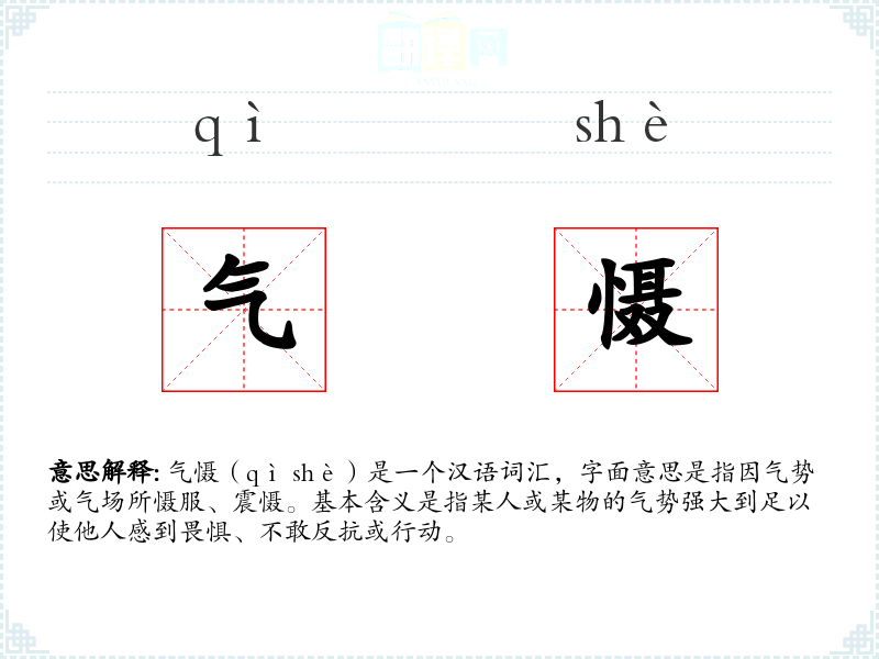 气慑(qì shè)是一个汉语词汇,字面意思是指因气势或气场所慑服、震慑。基本含义是指某人或某物的气势强大到足以使他人感到畏惧、不敢反抗或行动。