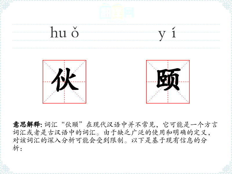 词汇“伙颐”在现代汉语中并不常见,它可能是一个方言词汇或者是古汉语中的词汇。由于缺乏广泛的使用和明确的定义,对该词汇的深入分析可能会受到限制。以下是基于现有信息的分析: