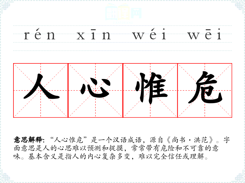 “人心惟危”是一个汉语成语,源自《尚书·洪范》。字面意思是人的心思难以预测和捉摸,常常带有危险和不可靠的意味。基本含义是指人的内心复杂多变,难以完全信任或理解。