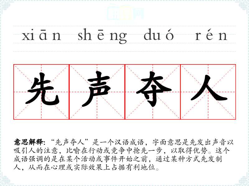 在文化中,“先声夺人”体现了对时机和策略的重视。在社会竞争激烈的环境中,能够先发制人往往被视为一种智慧和能力的体现。这个成语也反映了人对于“先”和“快”的价值观,即在任何竞争中,能够率先行动并取得优势是非常重要的。