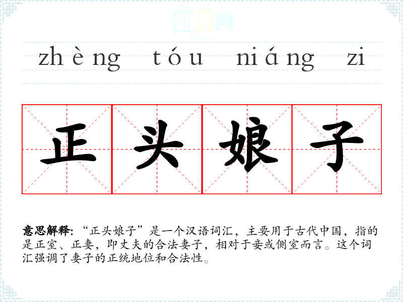 “正头娘子”是一个汉语词汇,主要用于古代**,指的是正室、正妻,即丈夫的合法妻子,相对于妾或侧室而言。这个词汇强调了妻子的正统地位和合法性。