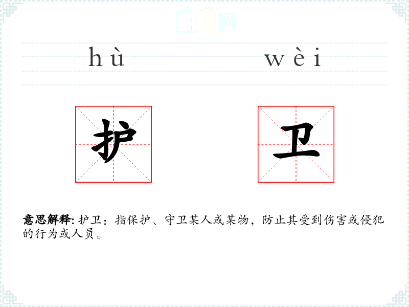 - 口语:在日常对话中,“护卫”可能指保护某人免受危险,如“他总是护卫着他的妹妹,不让她受到任何伤害。”