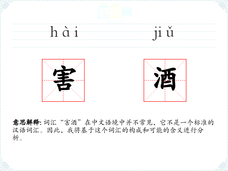 词汇“害酒”在中文语境中并不常见,它不是一个标准的汉语词汇。因此,我将基于这个词汇的构成和可能的含义进行分析。