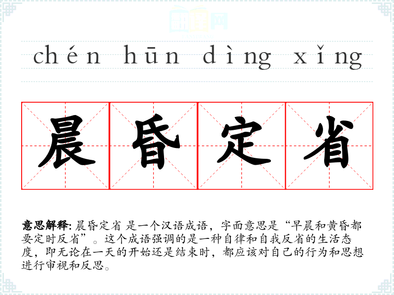 晨昏定省 是一个汉语成语,字面意思是“早晨和黄昏都要定时反省”。这个成语强调的是一种自律和自我反省的生活态度,即无论在一天的开始还是结束时,都应该对自己的行为和思想进行审视和反思。