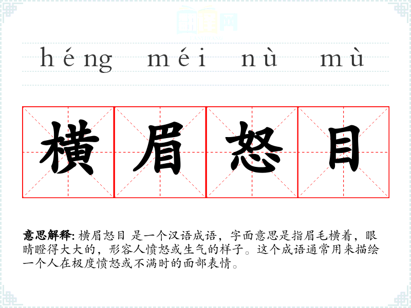 横眉怒目 是一个汉语成语,字面意思是指眉毛横着,眼睛瞪得大大的,形容人愤怒或生气的样子。这个成语通常用来描绘一个人在极度愤怒或不满时的面部表情。