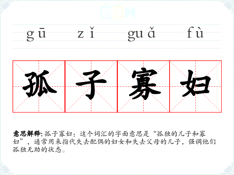 孤子寡妇:这个词汇的字面意思是“孤独的儿子和寡妇”,通常用来指代失去配偶的妇女和失去父母的儿子,强调他们孤独无助的状态。