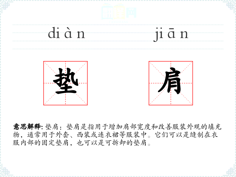 "垫肩"的意思解释、垫肩是什么意思由翻译网汉语词典查词提供。
