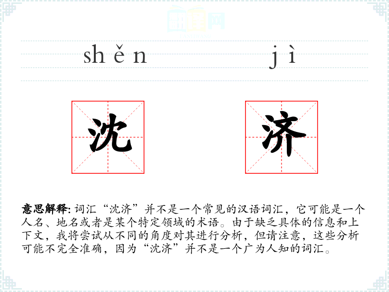 由于“沈济”不是一个常见词汇,对其的理解和分析存在很大的不确定性。在语言学习和表达中,了解词汇的具体上下文和背景是非常重要的。如果“沈济”是一个特定领域的术语,那么深入该领域的学习将有助于更好地理解其含义和用法。