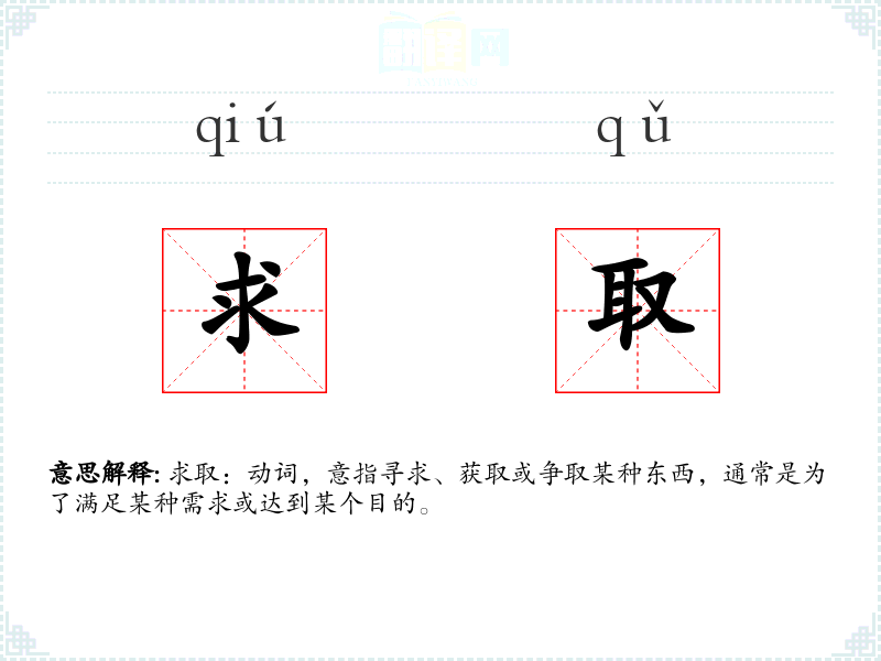 求取:动词,意指寻求、获取或争取某种东西,通常是为了满足某种需求或达到某个目的。