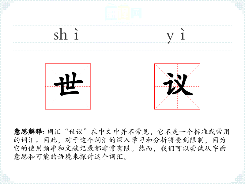 词汇“世议”在中文中并不常见,它不是一个标准或常用的词汇。因此,对于这个词汇的深入学*和分析将受到限制,因为它的使用频率和文献记录都非常有限。然而,我们可以尝试从字面意思和可能的语境来探讨这个词汇。