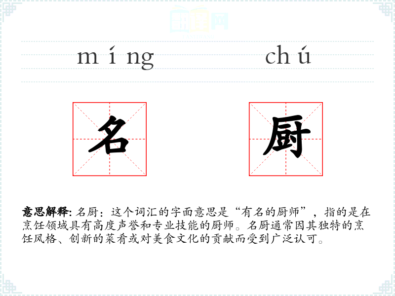 名厨:这个词汇的字面意思是“有名的厨师”,指的是在烹饪领域具有高度声誉和专业技能的厨师。名厨通常因其独特的烹饪风格、创新的菜肴或对美食文化的贡献而受到广泛认可。