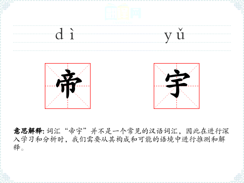 词汇“帝宇”并不是一个常见的汉语词汇,因此在进行深入学*和分析时,我们需要从其构成和可能的语境中进行推测和解释。