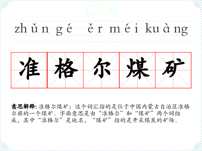 准格尔煤矿:这个词汇指的是位于**内蒙古自治区准格尔旗的一个煤矿。字面意思是由“准格尔”和“煤矿”两个词组成,其中“准格尔”是地名,“煤矿”指的是开采煤炭的矿场。