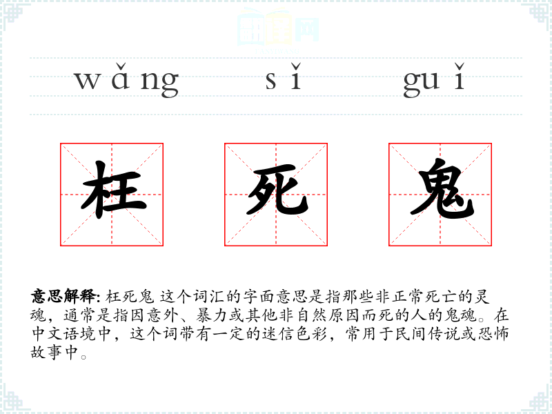 枉死鬼 这个词汇的字面意思是指那些非正常死亡的灵魂,通常是指因意外、暴力或其他非自然原因而死的人的鬼魂。在中文语境中,这个词带有一定的迷信色彩,常用于民间传说或恐怖故事中。