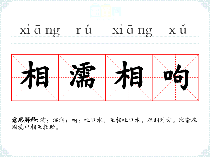 濡:湿润;呴:吐口水。互相吐口水,湿润对方。比喻在困境中相互救助。