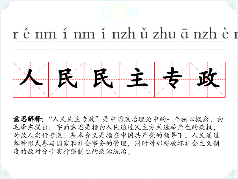 “人民民主专政”是**政治理论中的一个核心概念,由*提出。字面意思是指由人民通过民主方式选举产生的政权,对敌人实行专政。基本含义是指在共产党的领导下,人民通过各种形式参与国家和社会事务的管理,同时对那些破坏社会主义制度的敌对分子实行强制性的政治统治。