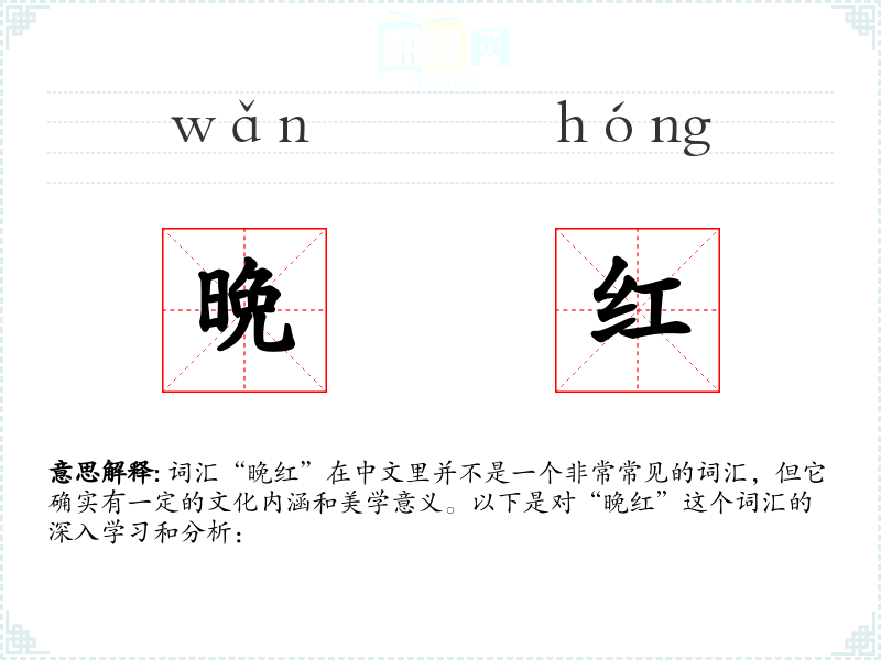 词汇“晚红”在中文里并不是一个非常常见的词汇,但它确实有一定的文化内涵和美学意义。以下是对“晚红”这个词汇的深入学*和分析: