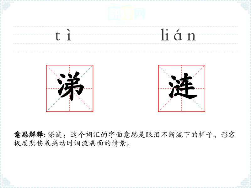 涕涟:这个词汇的字面意思是眼泪不断流下的样子,形容极度悲伤或感动时泪流满面的情景。