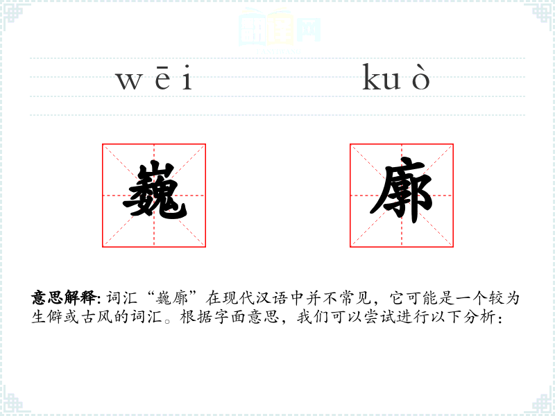 词汇“巍廓”在现代汉语中并不常见,它可能是一个较为生僻或古风的词汇。根据字面意思,我们可以尝试进行以下分析:
