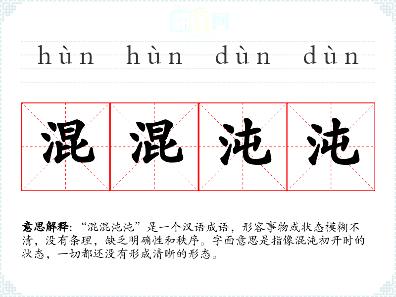 “混混沌沌”是一个汉语成语,形容事物或状态模糊不清,没有条理,缺乏明确性和秩序。字面意思是指像混沌初开时的状态,一切都还没有形成清晰的形态。