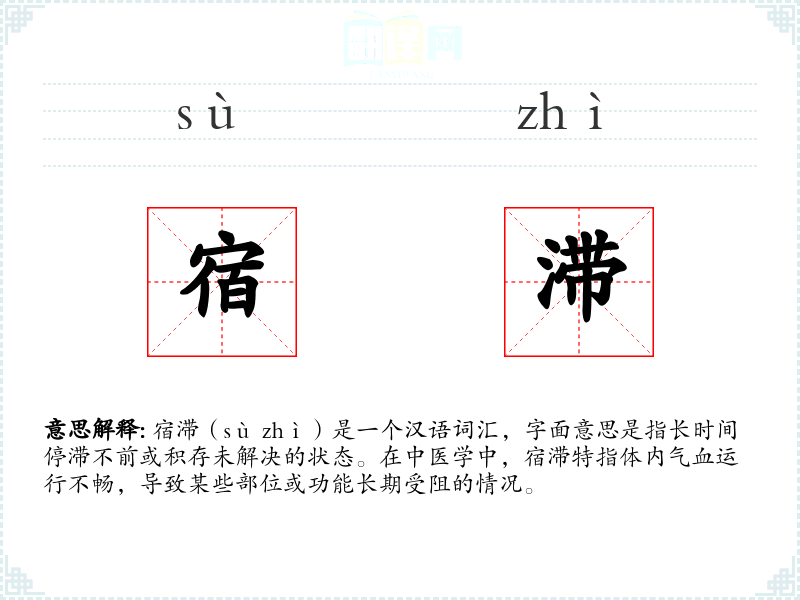 宿滞(sù zhì)是一个汉语词汇,字面意思是指长时间停滞不前或积存未解决的状态。在中医学中,宿滞特指体内气血运行不畅,导致某些部位或功能长期受阻的情况。