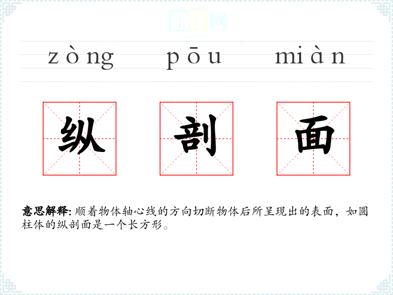 顺着物体轴心线的方向切断物体后所呈现出的表面,如圆柱体的纵剖面是一个长方形。