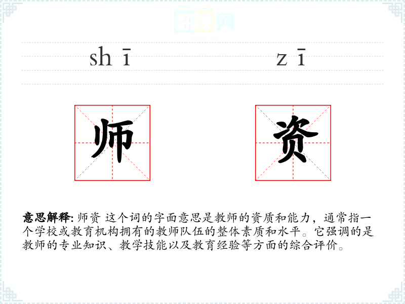 师资 这个词的字面意思是教师的资质和能力,通常指一个学校或教育机构拥有的教师队伍的整体素质和水平。它强调的是教师的专业知识、教学技能以及教育经验等方面的综合评价。