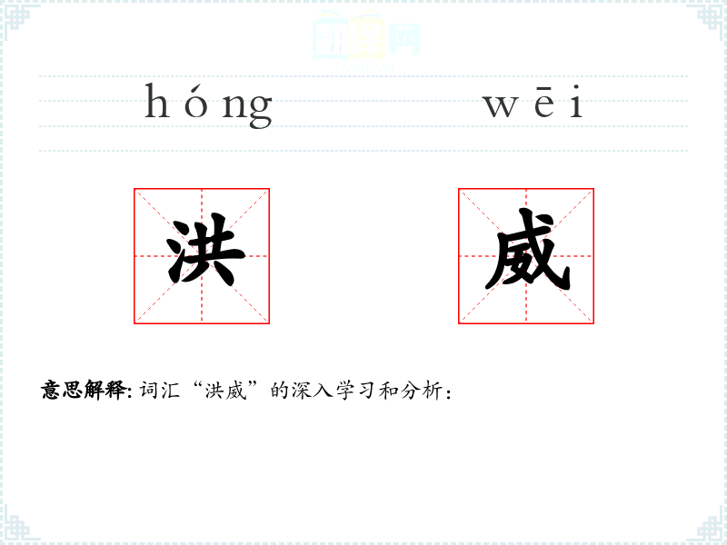 “洪威”一词通常指的是巨大的力量或影响力,特别是在权威或威严的语境中。字面意思可以理解为“宏大的威力”或“强大的威势”。