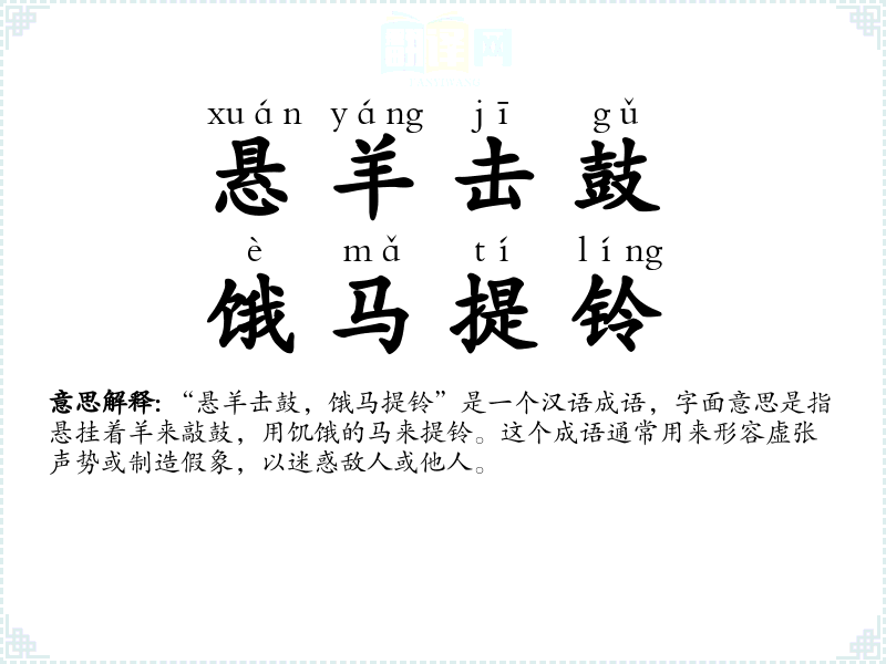 “悬羊击鼓,饿马提铃”是一个汉语成语,字面意思是指悬挂着羊来敲鼓,用饥饿的马来提铃。这个成语通常用来形容虚张声势或制造假象,以迷惑敌人或他人。