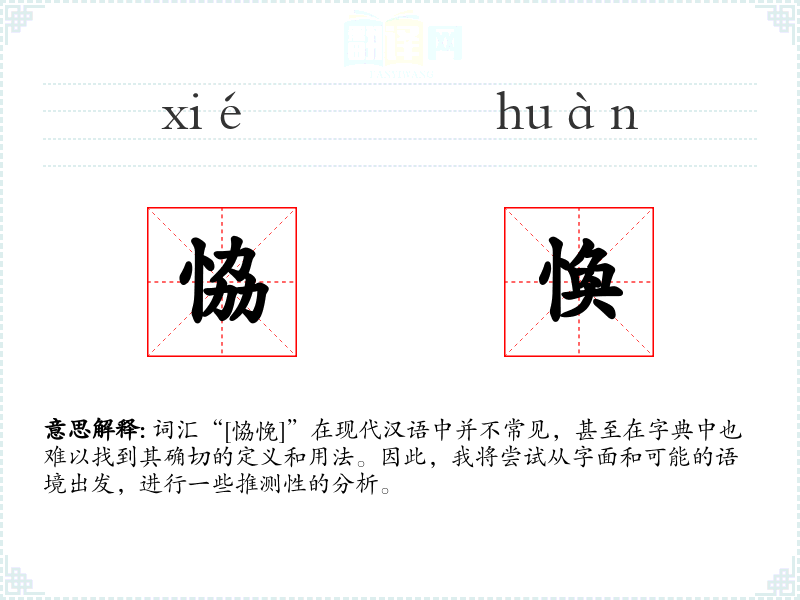 由于“恊悗”不是一个常用词汇,它在不同语境下的使用非常有限。在文学作品中,如果出现这个词,可能是用来形容人物在复杂或矛盾的情境中寻求解决办法的心理状态。