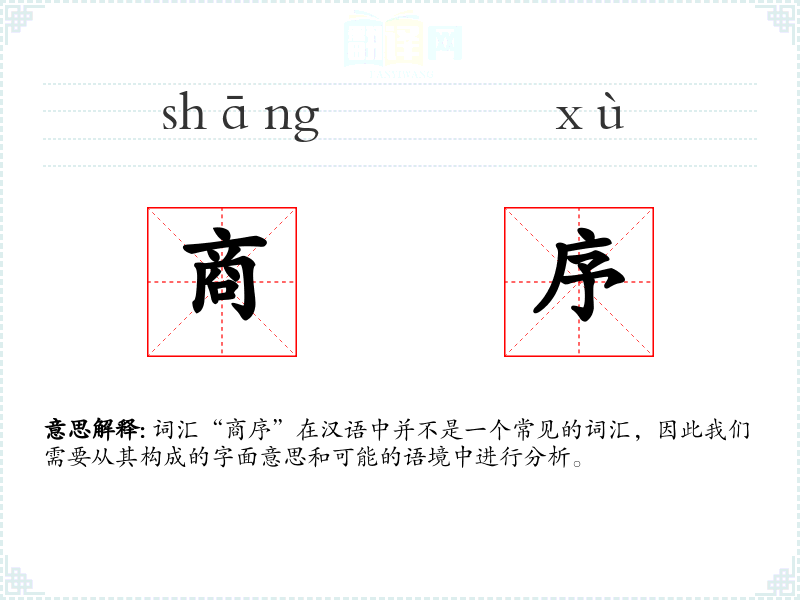 词汇“商序”在汉语中并不是一个常见的词汇,因此我们需要从其构成的字面意思和可能的语境中进行分析。