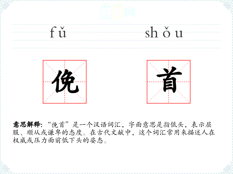 “俛首”是一个汉语词汇,字面意思是指低头,表示屈服、顺从或谦卑的态度。在古代文献中,这个词汇常用来描述人在权威或压力面前低下头的姿态。