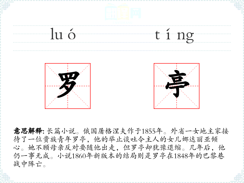 1.长篇小说。俄国屠格涅夫作于1855年。外省一女地主家接待了一位贵族青年罗亭,他的举止谈吐令主人的女儿娜达丽亚倾心。她不顾母亲反对要随他出走,但罗亭却犹豫退缩。几年后,他仍一事无成。小说1860年新版本的结局则是罗亭在1848年的巴黎巷战中阵亡。
