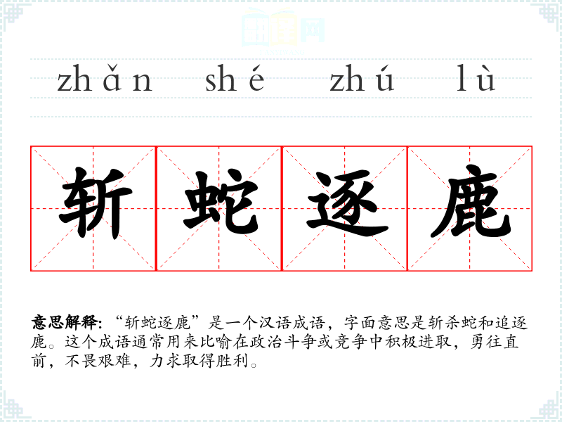 “斩蛇逐鹿”是一个汉语成语,字面意思是斩杀蛇和追逐鹿。这个成语通常用来比喻在政治斗争或竞争中积极进取,勇往直前,不畏艰难,力求取得胜利。