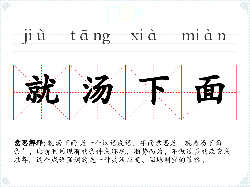 就汤下面 是一个汉语成语,字面意思是“就着汤下面条”,比喻利用现有的条件或环境,顺势而为,不做过多的改变或准备。这个成语强调的是一种灵活应变、因地制宜的策略。