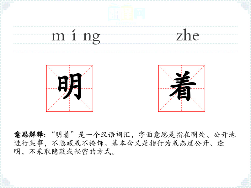 “明着”是一个汉语词汇,字面意思是指在明处、公开地进行某事,不隐藏或不掩饰。基本含义是指行为或态度公开、透明,不采取隐蔽或秘密的方式。