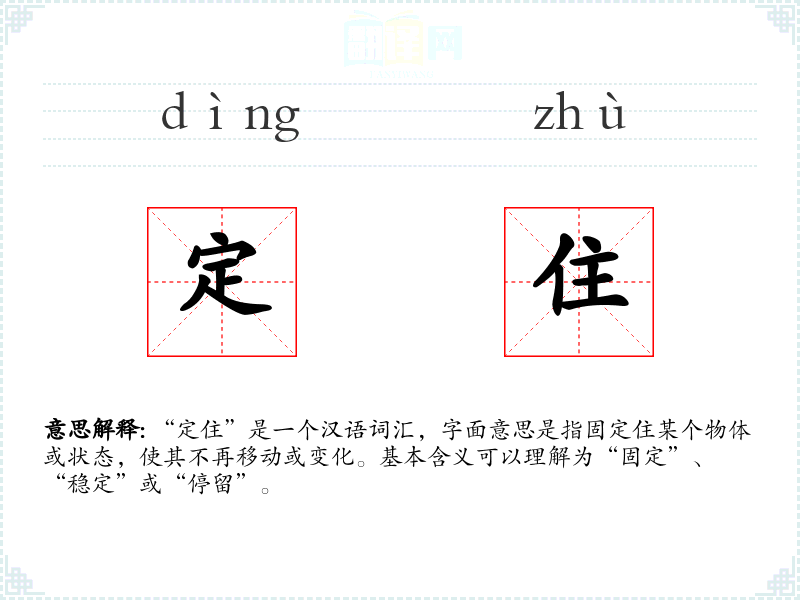 “定住”是一个汉语词汇,字面意思是指固定住某个物体或状态,使其不再移动或变化。基本含义可以理解为“固定”、“稳定”或“停留”。